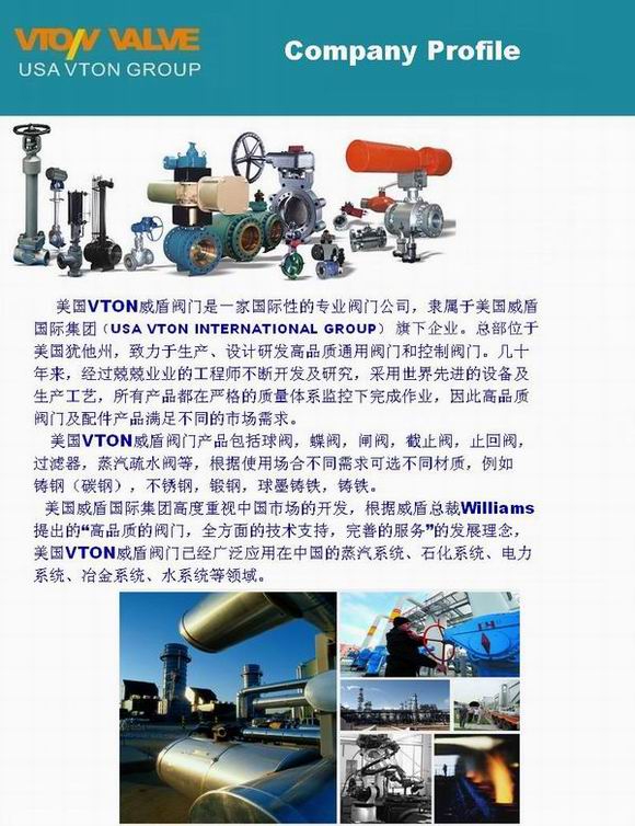 美國威盾國際集團高度重視中國市場的開發(fā),根據(jù)威盾總裁Williams提出的“高品質(zhì)的閥門,全方面的技術(shù)支持,完善的服務(wù)”的發(fā)展理念,美國VTON威盾閥門已經(jīng)廣泛應(yīng)用在中國的蒸汽系統(tǒng)、石化系統(tǒng)、電力系統(tǒng)、冶金系統(tǒng)、水系統(tǒng)等領(lǐng)域。 |